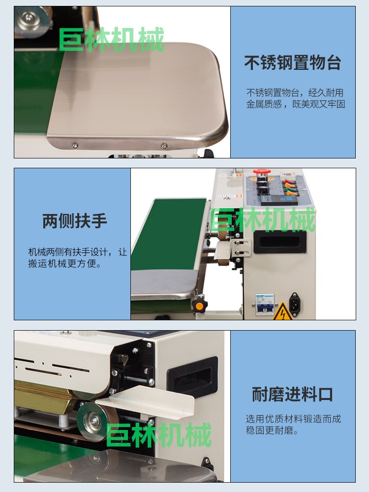 該機具有連續輸送、封口、油墨印制標簽(出廠日期、生產批號等)一次完成之功效,可封合印制任何一種可熱性的薄膜。