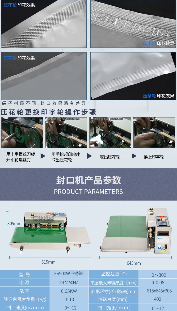 FR-900W全自動封口機,可以輸送臺加寬至400mm,承重加至10kg適用大米袋等較大較重產品封口。